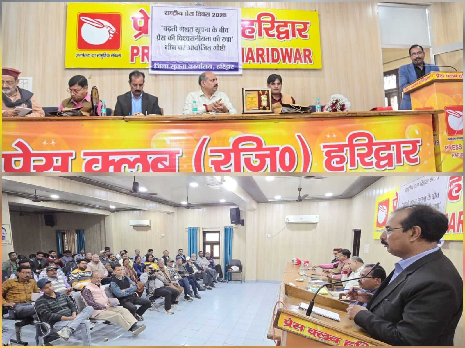 हरिद्वार/श्रीनगर गढ़वाल।राष्ट्रीय प्रेस दिवस के अवसर पर प्रेस क्लब सभागार में बढ़ती गलत सूचना के बीच प्रेस की विश्वसनीयता की रक्षा करना विषय पर गोष्ठी का आयोजन किया गया।जिसमें मुख्य अतिथि मुख्य विकास अधिकारी ललित नारायण मिश्रा एवं विशिष्ट अतिथि अपर जिलाधिकारी पीआर चौहान कार्यक्रम ने शामिल हुए। इस अवसर पर प्रेस क्लब अध्यक्ष/महामंत्री एवं प्रभारी जिला सूचना अधिकारी ने अतिथियों को पुष्प गुच्छ भेंटकर स्वागत किया। इस अवसर पर मुख्य विकास अधिकारी ललित नारायण मिश्रा ने उपस्थित प्रेस प्रतिनिधियों को राष्ट्रीय प्रेस दिवस की बधाई इव शुभकामनाएं देते हुए कहा कि आज एआई के युग में अपने आप को अपडेट एवं सावधान रखने के आवश्यकता है तथा टेक्नोलॉजी के युग में भी अपडेट रहना जरूरी है। उन्होंने कहा कि आज की गोष्ठी की जो थीम है बढ़ती गलत सूचना के बीच प्रेस की विश्वसनीयता की रक्षा करना इस पर सभी को खबर प्रकाशित करने से पूर्व संवाद करना जरूरी है। संवाद से ही विश्वसनीयता के साथ सही सूचना उपलब्ध होगी। उन्होंने कहा कि आज सनसनी खेज खबर बनाने के लिए भाम्रक हेडलाइन तैयार की जा रही है,जिससे ही हेडलाइन से ही खबर की स्थिति का पता चल जाता है।उन्होंने कहा कि प्रेस और प्रशासन के बीच बेहतर संवाद बनाए रखने के लिए समय समय पर गोष्ठी एवं कार्यशाला का आयोजन किया जायेगा। इस अवसर पर अपर जिलाधिकारी पीआर चौहान ने प्रेस प्रतिनिधियों को राष्ट्रीय प्रेस दिवस की शुभकामनाएं देते हुए कहा कि आज प्रेस की विश्वसनीयता को फर्जी खबरों,पैड न्यूज, पीत पत्रकारिता के माध्यम से सूचनाओं के प्रसार से कई चुनौतियों का सामना करना पड़ रहा है। फर्जी खबरों का प्रसार अक्सर सेसोशल मीडिया के माध्यम से फैलता है तथ्यों को तोड़ मरोड़ के पेश करता है तथा आमजन मानस को गुमराह करता है इसके लिए यह जरूरी है कि हमें अपने आप को एक्टिव रखना जरूरी है। उन्होंने महिला सशक्तिकरण पर कहा की मातृशक्ति सभ्य एवं पढ़ी लिखी होगी तो दो परिवार एवं समाज आगे बढ़ेगा।उन्होंने कहा कि प्रशासन एवं प्रेस के बीच में संवाद निरंतर होता रहेगा,जिससे कि जो भी समस्याएं होगी संवाद करने से ही समाधान होगा।
