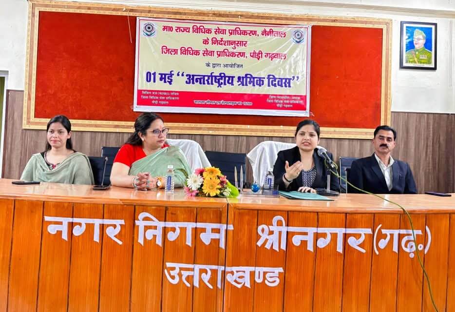 श्रीनगर गढ़वाल।उत्तराखण्ड राज्य विधिक सेवा प्राधिकरण नैनीताल एवं जिला विधिक सेवा प्राधिकरण,पौड़ी गढ़वाल के निर्देशानुसार सिविल जज (जू.डि.) कु.अलका/अध्यक्ष तहसील विधिक सेवा समिति की अध्यक्षता में अंतर्राष्ट्रीय श्रमिक दिवस के अवसर पर आज दिनांक 1 मई 2025 को स्थान नगर निगम श्रीनगर,गढ़वाल में विधिक साक्षरता एवं जागरूकता शिविर का आयोजन किया गया।