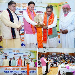 अपने गृह राज्य में जाने से कतराते हैं लेकिन जब तीनों स्तर के चुनाव एक साथ होंगे तो वो वोट देने अवश्य जाएँगे। अब समय आ गया है कि हम आधुनिक तकनीक,चुनाव आयोग की पारदर्शिता और जनता के सहयोग से इस संतुलन को पुनः स्थापित करें।मुख्यमंत्री ने कहा कि जब अमेरिका,जापान,ब्राज़ील और स्वीडन जैसे देशों में एक साथ चुनाव की व्यवस्था हो सकती है तो क्या भारत जैसे विश्व के सबसे बड़े लोकतांत्रिक देश में ये व्यवस्था नहीं हो सकती? आदरणीय प्रधानमंत्री मोदी जैसे दृढ़ और संकल्पित प्रधान सेवक हमारे पास हैं तो देश हित का कोई काम रुक जाए,ऐसा हो नहीं सकता।प्रधानमंत्री के मार्गदर्शन में तैयार किया गया जो ड्राफ़्ट लोक सभा में पेश किया गया,वो बहुत ही गहन शोध और विश्लेषण के बाद तैयार किया गया है। इस ड्राफ्ट में एक-एक परिस्थिति का ध्यान रखा गया है कि कैसे सभी राज्यों में ये व्यवस्था लागू करनी है और लागू करने के बाद यदि किसी राज्य की सरकार बीच में भंग हो गई तो उस स्थिति में कैसे चुनाव होंगे। फ़िलहाल इस क़ानून को व्यापक विचार विमर्श हेतु संयुक्त संसदीय समिति को भेजा गया है,मुख्यमंत्री ने कहा कि उनको पूर्ण विश्वास है कि एक दिन ये एक राष्ट्र-एक चुनाव की व्यवस्था भारत में अवश्य लागू होगी और यह कानून भारत में लोकतंत्र को और अधिक मज़बूत करने में सहायक सिद्ध होगा।इस अवसर पर भाजपा के राष्ट्रीय महामंत्री तथा एक राष्ट्र एक चुनाव के राष्ट्रीय प्रभारी सुनील बंसल ने मुख्यमंत्री पुष्कर सिंह धामी को उत्तराखंड में यूसीसी सबसे पहले लागू करने के लिए बधाई दी।उन्होंने ने कहा कि उत्तराखंड ने यूसीसी लागू कर देश के समक्ष एक आदर्श प्रस्तुत किया है।अन्य राज्य भी इसका अनुपालन करने लिए उत्सुक दिख रहे हैं।उन्होंने कहा की एक राष्ट्र एक चुनाव हर तरह से देश हित में है।इसके सम्बन्ध में व्यापक जन जागरूकता की आवश्यकता है।कार्यक्रम में राजयसभा सांसद भाजपा प्रदेश अध्यक्ष महेंद्र भट्ट,कैबिनेट मंत्री गणेश जोशी,सौरभ बहुगुणा,प्रदेश महामंत्री संगठन अजेय कुमार,पर्यावरणविद पद्म अनिल जोशी,जागर गायिका पद्म बसंती बिष्ट,पद्म कन्हेया लाल पोखरियाल सहित बड़ी संख्या में पूर्व सैनिक,साधु संत विभिन्न क्षेत्रों के प्रबुद्धजन मौजूद रहे।