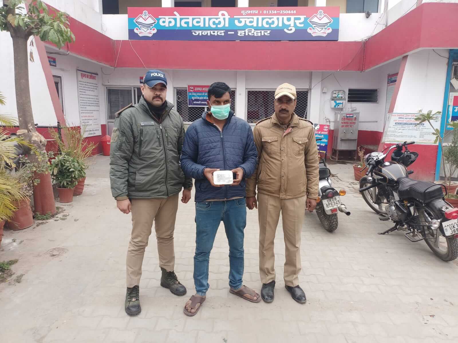 ज्वालापुर-हरिद्वार/श्रीनगर गढ़वाल।हरिद्वार पुलिस ने ज्वालापुर में नशा तस्करों के विरुद्ध प्रभावी कार्रवाई करते हुए 1 अभियुक्त को अवैध मादक पदार्थ स्मैक के साथ गिरफ्तार किया। अभियुक्त के कब्जे से 31.10 ग्राम स्मैक बरामद हुआ। ड्रग्स फ्री देवभूमि मिशन को सफल बनाने के उद्देश्य से वरिष्ठ पुलिस अधीक्षक हरिद्वार ने अवैध मादक पदार्थों की तस्करी रोकने और नशा तस्करों के विरुद्ध कड़ी कार्रवाई करने के निर्देश दिए। निर्देशों के अनुपालन में कोतवाली ज्वालापुर पुलिस द्वारा चैकिंग के दौरान रईस पुत्र सईद,निवासी ग्राम लादपुर,कोतवाली लक्सर,हरिद्वार को लालपुर के पार नहर पटरी आम के पेड़ के पास से गिरफ्तार किया गया। अभियुक्त के खिलाफ कोतवाली ज्वालापुर में अपराध संख्या एक्ट में अभियोग पंजीकृत किया गया। अभियुक्त का आपराधिक इतिहास भी रहा है। वह पूर्व में कोतवाली ज्वालापुर से NDPS और गैंगस्टर एक्ट के तहत जेल जा चुका है। गिरफ्तार अभियुक्त,रईस पुत्र सईद ग्राम लादपुर कोतवाली लक्सर हरिद्वार,पुलिस टीम,उप निरीक्षक रविंद्र जोशी,कांस्टेबल महावीर पुंण्डीर,कांस्टेबल कर्म सिंह चौहान।