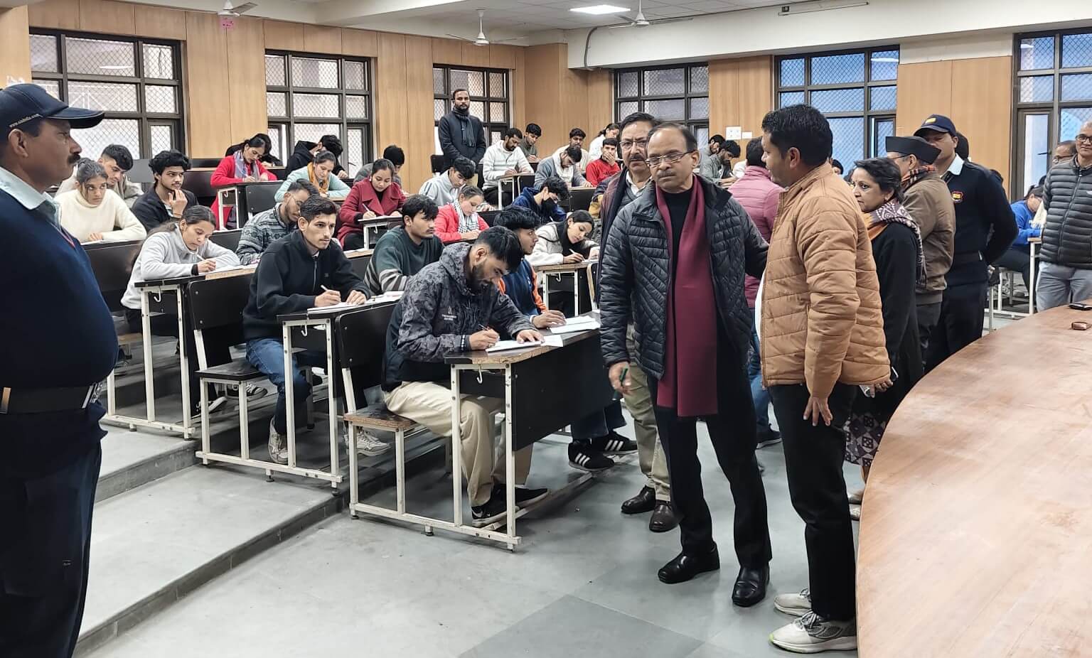 श्रीनगर गढ़वाल। 18 दिसंबर हेमवती नंदन बहुगुणा गढ़वाल विश्वविद्यालय के कुलपति प्रो.प्रकाश सिंह ने आज बिरला परिसर में विशेष कार्याधिकारी परीक्षा के दौरान परीक्षा कार्यों का औचक निरीक्षण किया। इस परीक्षा केंद्र पर कुल 28 कक्षाओं में परीक्षार्थी बैठे हुए थे,जो इस परीक्षा का सबसे बड़ा केंद्र था।कुलपति ने परीक्षा संचालन की स्थिति की समीक्षा करते हुए केन्द्राध्यक्ष प्रो.रमा मैखुरी से परीक्षा व्यवस्था और सफाई पर विशेष ध्यान रखने को कहा।परीक्षा नियंत्रक कार्यालय से सभी तीनों सहायक परीक्षा नियंत्रक डॉ.विजय सिंह बिष्ट,डॉ.दीपक कुमार राणा और रमेश राणा भी निरीक्षण के दौरान उपस्थित रहे। इस अवसर पर छात्र संघ के पदाधिकारी अध्यक्ष भी मौजूद थे। केंद्राध्यक्ष प्रो.रमा मैखुरी ने बताया कि सभी शिक्षकों और कर्मचारियों का सहयोग परीक्षा संचालन में मिल रहा है और परीक्षा सुचारू रूप से संपन्न हो रही है।
