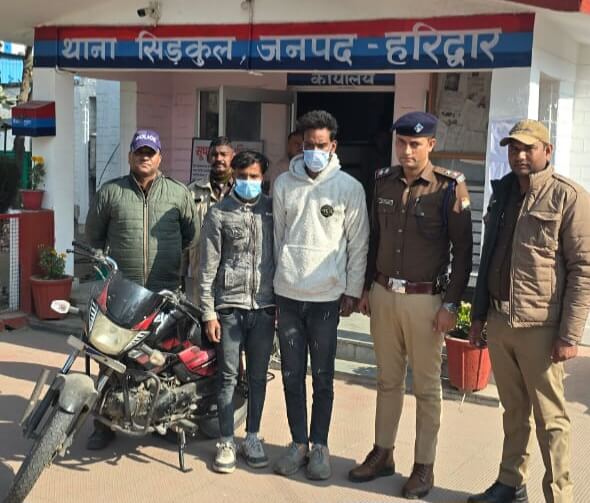 प्रदीप कुमार सिडकुल-हरिद्वार/श्रीनगर गढ़वाल। हरिद्वार पुलिस ने थाना सिडकुल क्षेत्र में हुई मोबाइल स्नैचिंग की घटना का सफल खुलासा करते हुए दो आरोपियों को गिरफ्तार किया है। पुलिस ने आरोपियों के कब्जे से छीना गया मोबाइल फोन भी बरामद कर लिया है। पुलिस के अनुसार 22 दिसंबर 2025 को शिवम वर्मा निवासी शाहजहांपुर उत्तर प्रदेश,वर्तमान निवासी रोशनाबाद सिडकुल ने थाना सिडकुल में शिकायत दर्ज कराई थी। शिकायत में बताया गया था कि 5 नवंबर 2025 को कालागेट रोशनाबाद सिडकुल के पास दो अज्ञात मोटरसाइकिल सवारों ने झपट्टा मारकर उसका वीवो टी-4 मोबाइल फोन छीन लिया था और मौके से फरार हो गए थे। घटना के बाद सिडकुल पुलिस द्वारा मामले की जांच शुरू की गई। जांच के दौरान पुलिस टीम ने महिंद्रा ग्राउंड के पास झाड़ियों के आसपास से दो संदिग्ध व्यक्तियों को पकड़ लिया। पूछताछ और तलाशी के दौरान उनके कब्जे से छीना गया मोबाइल फोन बरामद किया गया। गिरफ्तार आरोपियों की पहचान मोहम्मद फैज पुत्र शरीफ निवासी ग्राम बड़ागांव थाना पुवायां जिला शाहजहांपुर,वर्तमान निवासी रोशनाबाद सिडकुल,उम्र 18 वर्ष तथा तोहिद पुत्र सुल्तान निवासी रोशनाबाद झंडा चौक के पास थाना सिडकुल,उम्र 19 वर्ष के रूप में हुई है। पुलिस द्वारा दोनों आरोपियों के विरुद्ध मामले में आगे की आवश्यक कानूनी कार्रवाई की जा रही है। बरामदगी में एक वीवो टी-4 मोबाइल फोन शामिल है। इस कार्रवाई को अंजाम देने वाली पुलिस टीम में अतिरिक्त उप निरीक्षक हरिश्चंद्र,कांस्टेबल प्रदीप कुमार और कांस्टेबल अनिल कंडारी शामिल रहे।हरिद्वार पुलिस का कहना है कि क्षेत्र में अपराधों पर प्रभावी नियंत्रण और नागरिकों की सुरक्षा के लिए इस प्रकार की कार्रवाई आगे भी निरंतर जारी रहेगी।