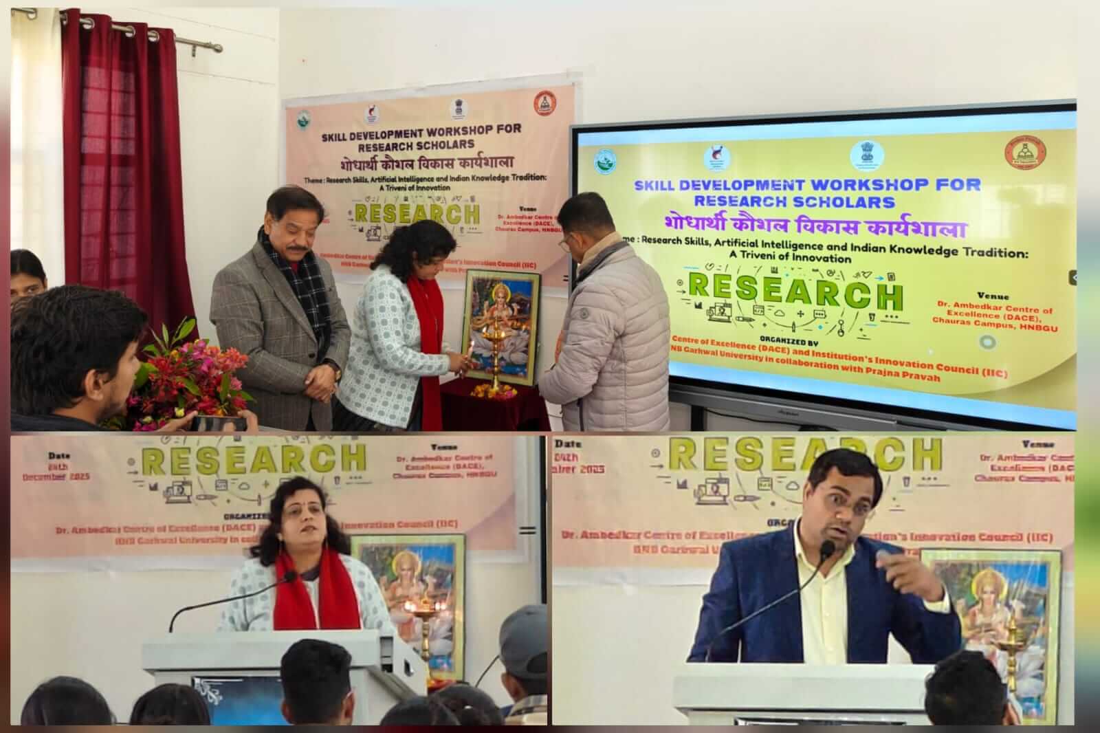 श्रीनगर गढ़वाल। हेमवती नंदन बहुगुणा गढ़वाल केंद्रीय विश्वविद्यालय में एक दिवसीय शोधार्थी कौशल विकास कार्यशाला (द्वितीय संस्करण) का सफल आयोजन किया गया।कार्यशाला का आयोजन डॉ.अंबेडकर सेंटर ऑफ एक्सीलेंस (डीएसीई) एवं इंस्टीट्यूशंस इनोवेशन काउंसिल (आईआईसी) द्वारा प्रज्ञा प्रवाह के सहयोग से किया गया।कार्यक्रम का शुभारंभ दीप प्रज्ज्वलन के साथ हुआ,जिसे प्रो.एम.एस.पंवार,डीन (भर्ती एवं पदोन्नति),हेमवती नंदन बहुगुणा गढ़वाल केंद्रीय विश्वविद्यालय,भगवती प्रसाद राघव,क्षेत्र संयोजक प्रज्ञा प्रवाह (उत्तराखंड एवं उत्तर प्रदेश) तथा डॉ.कविता भट्ट,दर्शनशास्त्र विभाग द्वारा संयुक्त रूप से संपन्न किया गया। उद्घाटन सत्र में गुणवत्तापूर्ण,नैतिक एवं समाजोपयोगी अनुसंधान के महत्व पर विस्तार से प्रकाश डाला गया। अपने संबोधन में प्रो.एम.एस.पंवार ने शोधार्थियों से शोध कौशल विकसित करने तथा उत्कृष्ट अनुसंधान के माध्यम से राष्ट्र के विकास में योगदान देने का आह्वान किया। डॉ.कविता भट्ट ने भारतीय शोध दृष्टि के दार्शनिक पक्ष को रेखांकित करते हुए भारतीय ज्ञान परंपरा में निहित मूल्यों और शोध की मौलिकता पर प्रकाश डाला।कार्यशाला के दौरान शोधार्थियों के कौशल विकास के लिए विभिन्न विशेषज्ञ सत्र आयोजित किए गए। डॉ.रोहित महर ने अकादमिक लेखन एवं आधुनिक अनुसंधान उपकरणों पर व्याख्यान दिया,जिसमें साहित्यिक चोरी जांच उपकरण,डेटा विश्लेषण सॉफ्टवेयर,गूगल स्कॉलर,रिसर्चगेट,मैटलैब,केमड्रॉ और लिंक्डइन जैसे प्लेटफॉर्म के उपयोग पर जानकारी दी गई। डॉ.बलकृष्ण बधानी ने भारतीय ज्ञान परंपरा में संस्कृत भाषा की भूमिका तथा दर्शन,विज्ञान,साहित्य और शिक्षा में इसके योगदान पर प्रकाश डाला।डॉ.आशीष बहुगुणा ने शोधार्थियों को राष्ट्रीय एवं अंतरराष्ट्रीय शोध फेलोशिप और अनुदान योजनाओं की जानकारी दी,जिनमें सीएसआईआर,आईसीएसएसआर,आईसीपीआर,आईसीएआर, महिला शोध फेलोशिप,स्टार्टअप एवं इंटर्नशिप योजनाएं तथा उत्तराखंड सरकार की छात्रवृत्तियां शामिल रहीं।डॉ.वरुण बर्थवाल ने अनुसंधान एवं उच्च शिक्षा में कृत्रिम बुद्धिमत्ता के उपयोग पर सत्र प्रस्तुत किया,जिसमें पाइथन,मशीन लर्निंग,लार्ज लैंग्वेज मॉडल्स और डेटा विश्लेषण में एआई के प्रयोग पर चर्चा की गई। कार्यशाला का एक विशेष सत्र भगवती प्रसाद राघव द्वारा संबोधित किया गया। उन्होंने राष्ट्रीय एकता एवं अखंडता पर बल देते हुए शोधार्थियों से भारतीय दृष्टिकोण के साथ अनुसंधान करने और राष्ट्र निर्माण में बौद्धिक योगदान देने का आह्वान किया। साथ ही भारतीय ज्ञान परंपरा के आधुनिक संदर्भों में उपयोग की आवश्यकता पर जोर दिया।कार्यक्रम के प्रथम सत्र की अध्यक्षता डॉ.मनीष उनियाल,