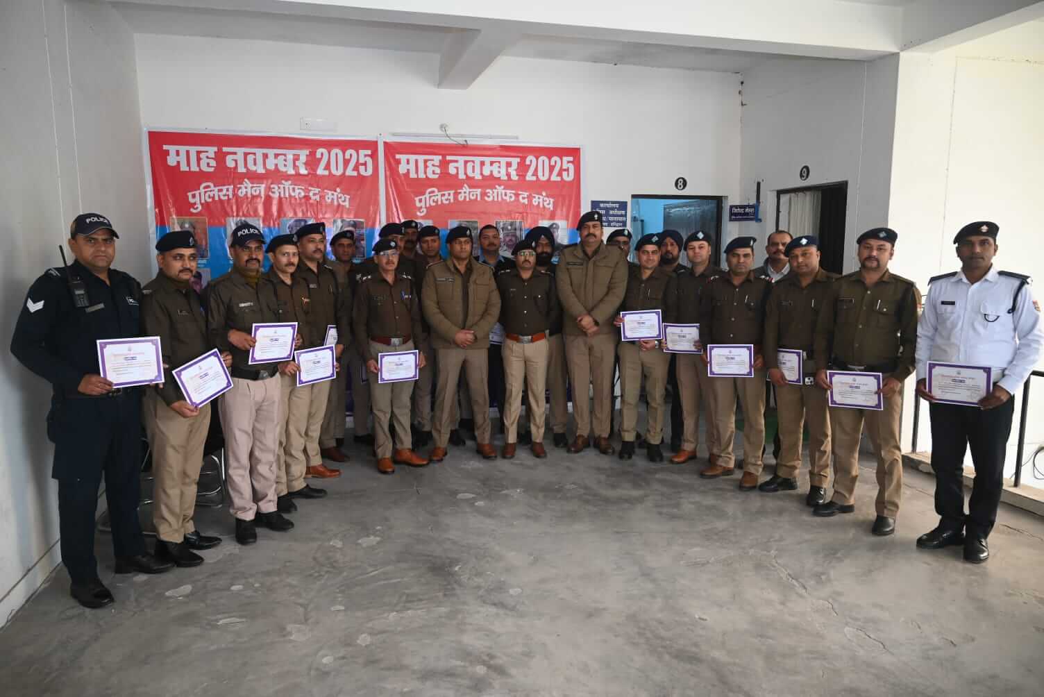 हरिद्वार/श्रीनगर गढ़वाल। हरिद्वार कर्तव्यनिष्ठा,लगन और ड्यूटी के प्रति समर्पण का सम्मान करते हुए हरिद्वार पुलिस द्वारा पुलिस मैन ऑफ द मंथ योजना के अंतर्गत माह नवंबर 2025 के लिए उत्कृष्ट कार्य करने वाले 32 पुलिसकर्मियों को सम्मानित किया गया। यह सम्मान वरिष्ठ पुलिस अधीक्षक हरिद्वार द्वारा प्रदान किया गया। इस अवसर पर कहा गया कि ईमानदारी,मेहनत और जनसेवा की भावना से कार्य करने वाले पुलिसकर्मी ही हरिद्वार पुलिस की असली ताकत और मजबूत नींव हैं। ऐसे कर्मठ कार्मिकों को सम्मानित करने से न केवल उनका आत्मविश्वास बढ़ता है,बल्कि अन्य पुलिसकर्मियों को भी बेहतर कार्य करने की प्रेरणा मिलती है। यह पहल हरिद्वार पुलिस को और अधिक सशक्त,संवेदनशील एवं जनसेवा के प्रति समर्पित बनाने की दिशा में एक सार्थक कदम मानी जा रही है।पुलिस मैन ऑफ द मंथ के अंतर्गत चयनित कार्मिकों में विभिन्न कोतवाली,थानों और इकाइयों के अधिकारी व कर्मचारी शामिल हैं। चयनित सूची के अनुसार कोतवाली नगर से कांस्टेबल 19 दिनेश धामी,थाना श्यामपुर से हेड कांस्टेबल 196 बृजमोहन और कांस्टेबल 632 तेजेन्द्र सिंह,कोतवाली कनखल से कांस्टेबल 653 उमेद सिंह,कोतवाली ज्वालापुर से उप निरीक्षक रविन्द्र जोशी और कांस्टेबल 699 दिनेश कुमार को चुना गया। थाना बहादराबाद से उप निरीक्षक जगमोहन सिंह, कोतवाली रानीपुर से कांस्टेबल 256 सुमन डोबाल,थाना सिड़कुल से उप निरीक्षक अनिल बिष्ट,कोतवाली रुड़की से कांस्टेबल 772 सुरेश तोमर,कोतवाली गंगनहर से कांस्टेबल 1358 राहुल कुमार और कांस्टेबल 570 अर्जुन सिंह को सम्मानित किया गया। इसके अतिरिक्त थाना कलियर से कांस्टेबल 595 जितेन्द्र सिंह,कोतवाली लक्सर से उप निरीक्षक विपिन कुमार,थाना पथरी से कांस्टेबल 1533 अनिल पंवार,थाना खानपुर से अपर उप निरीक्षक योगेन्द्र सिंह,कोतवाली मंगलौर से कांस्टेबल 381 सुधीर,थाना झबरेड़ा से हेड कांस्टेबल 93 हरेन्द्र,थाना भगवानपुर से कांस्टेबल 597 राकेश और थाना बुग्गावाला से अपर उप निरीक्षक बलवीर सिंह का चयन किया गया। कार्यालय क्षेत्राधिकारी नगर से कांस्टेबल 978 उपेन्द्र कुमार,सीआईयू रुड़की से हेड कांस्टेबल 362 मनमोहन भण्डारी,दूरसंचार से महिला हेड कांस्टेबल 321 रितिका सिंह,फायर सर्विस रुड़की से फायरमैन हरीश चन्द्र,पुलिस लाइन हरिद्वार से अपर उप निरीक्षक बचन सिंह और आईआरबी द्वितीय से कांस्टेबल 4196 अर्जुन सिंह को भी इस सम्मान से नवाजा गया। इसके साथ ही अभियोजन कार्यालय से हेड कांस्टेबल 263 मनमोहन सिंह,यातायात हरिद्वार से कांस्टेबल 33 टीपी आनन्द नौटियाल,सीपीयू हरिद्वार से हेड कांस्टेबल अरविन्द गिल और हेड कांस्टेबल संजय उनियाल,एएनटीएफ से हेड कांस्टेबल 342 राजवर्धन तथा गौवंश संरक्षण स्क्वॉड से कांस्टेबल 706 प