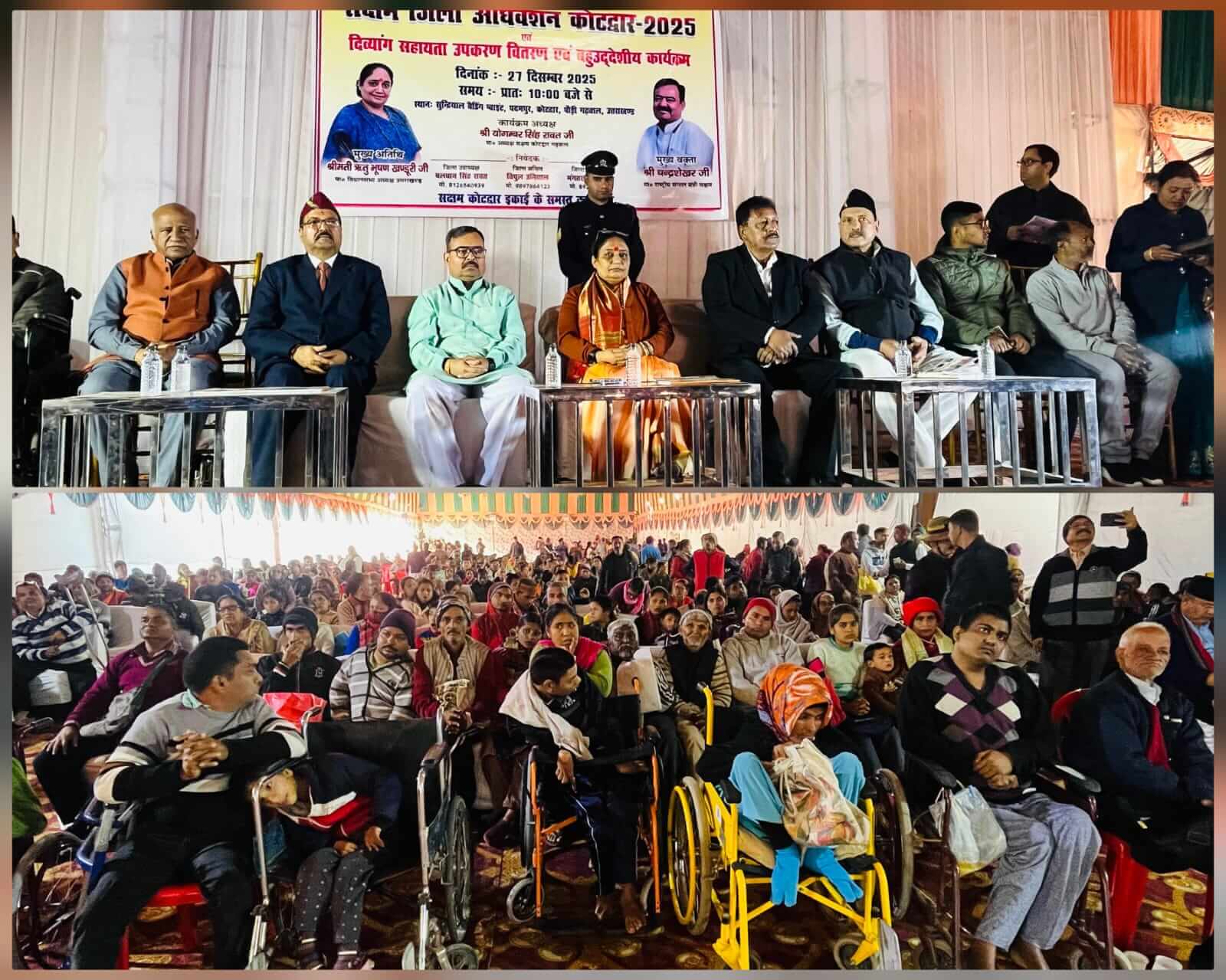 कोटद्वार-पौड़ी/श्रीनगर गढ़वाल।विकासखण्ड दुगड्डा के अंतर्गत सुंदरियाल वेडिंग पॉइंट पदमपुर कोटद्वार में समदृष्टि,क्षमता विकास एवं अनुसंधान मंडल (सक्षम) के तत्वावधान में दिव्यांग सहायता उपकरण वितरण एवं बहुउद्देशीय कार्यक्रम का आयोजन किया गया। शिविर में बड़ी संख्या में स्थानीय लोग पहुंचे और विभिन्न विभागों द्वारा उन्हें योजनाओं का लाभ देने के साथ ही उनकी समस्याओं का त्वरित समाधान कराया गया। कार्यक्रम की मुख्य अतिथि विधानसभा अध्यक्षा उत्तराखंड ॠतु भूषण खंडूरी द्वारा दीप प्रज्ज्वलित कर कार्यक्रम का शुभारंभ किया। साथ ही उनके द्वारा विभागीय स्टाॅलों का निरीक्षण किया। उन्होंने दिव्यांगजनों को समाज की मुख्यधारा से जोड़ने की आवश्यकता पर बल दिया।उन्होंने कहा कि दिव्यांगजनों के जीवन में हर्ष,उल्लास एवं सकारात्मकता लाना अत्यंत आवश्यक है,ताकि वे सम्मानपूर्वक एवं आत्मनिर्भर जीवन व्यतीत कर सकें। उन्होंने दिव्यांगजनों के दैनिक जीवन को अधिक सरल,सुगम एवं सुविधाजनक बनाने पर विस्तार से चर्चा करते हुए कहा कि समाज संयुक्त प्रयास इस दिशा में अत्यंत महत्वपूर्ण है। उन्होंने बताया कि विभिन्न विद्यालयों एवं संस्थानों में दिव्यांगजनों को रोजमर्रा के जीवन में उपयोगी कौशलों का प्रशिक्षण दिया जा रहा है,जो उनके आत्मनिर्भर बनने की दिशा में एक महत्वपूर्ण कदम है। उन्होंने दिव्यांगजनों को विशेष बताते हुए कहा कि प्रत्येक दिव्यांगजन में कोई न कोई विशिष्ट कौशल निहित होता है,जिसे पहचानकर उसका समुचित विकास किया जाना चाहिए।उन्होंने कहा कि सरकार का निरंतर प्रयास है कि दिव्यांगजनों को समाज की मुख्यधारा में सम्मानजनक स्थान मिले तथा उनके जीवन को अधिक सुगम एवं सुविधाजनक बनाया जा सके। जिला समाज कल्याण अधिकारी रोहित दुबड़िया द्वारा दिव्यांगजनों के लिए संचालित समस्त कल्याणकारी योजनाओं की विस्तृत जानकारी दी गयी।उन्होंने बताया कि विभाग का निरंतर प्रयास है कि जनपद के समस्त जरूरतमंद दिव्यांगजनों तक केंद्र एवं राज्य सरकार द्वारा संचालित कल्याणकारी योजनाओं की जानकारी पहुंचे एवं उन्हें योजनाओं का पूर्ण लाभ प्राप्त हो। उन्होंने स्पष्ट किया कि दिव्यांगजनों की हर संभव सहायता सुनिश्चित की जाएगी।उन्होंने अवगत कराया कि शिविर में लगाए गए यूडी आईडी कार्ड करेक्शन एवं अपडेट संबंधी जानकारी स्टॉल के माध्यम से लेते हुए आमजन इन सेवाओं का लाभ प्राप्त कर सकते हैं। उन्होंने अवगत करवाया कि स्वास्थ्य विभाग के माध्यम से दिव्यांगजन दिव्यांग प्रमाण-पत्र बनवा सकते हैं,जिसके उपरांत दिव्यांगजन केंद्र एवं राज्य सरकार की समस्त कल्याणकारी योजनाओं लिए पात्र हो जाते हैं। इसके उपरांत दिव्यांगजन इन