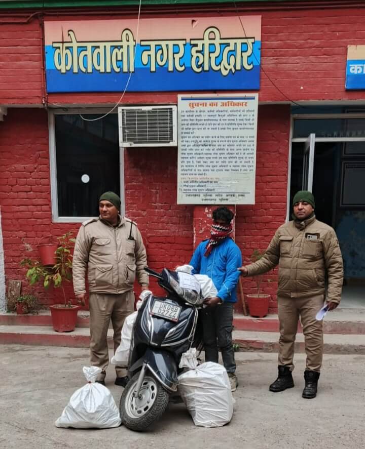 हरिद्वार/श्रीनगर गढ़वाल। वरिष्ठ पुलिस अधीक्षक हरिद्वार के निर्देश पर नशा तस्करी के खिलाफ चलाए जा रहे अभियान के तहत कोतवाली नगर पुलिस ने कार्रवाई करते हुए स्कूटी से शराब की तस्करी कर रहे एक आरोपी को चंडी चौक क्षेत्र से गिरफ्तार किया है। पुलिस जांच के दौरान तस्करी में प्रयुक्त स्कूटी सहित 348 पव्वे टेट्रा पैक देशी शराब बरामद की गई। गिरफ्तार आरोपी की पहचान राजा पुत्र ब्रह्मदेव सैनी निवासी लकड़ बस्ती, चंडी चौक,हरिद्वार के रूप में हुई है,जिसकी उम्र 22 वर्ष बताई गई है। पुलिस ने आरोपी के खिलाफ नियमानुसार मुकदमा दर्ज कर आगे की कार्रवाई शुरू कर दी है।इस कार्रवाई में उपनिरीक्षक नंदकिशोर गडावी,हेड कांस्टेबल 280 चंद्रशेखर भट्ट और कांस्टेबल 227 गंभीर सिंह शामिल रहे।