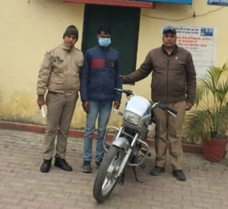 प्रदीप कुमार पथरी-हरिद्वार/श्रीनगर गढ़वाल। थाना पथरी क्षेत्र में मोटरसाइकिल चोरी के मामले में पुलिस को सफलता मिली है।दिनांक 27 दिसंबर 2025 को विजय कुमार निवासी ग्राम शाहपुर शीतलाखेड़ा,थाना पथरी,जनपद हरिद्वार द्वारा अपनी मोटरसाइकिल चोरी होने की शिकायत दर्ज कराई गई थी।शिकायत के आधार पर थाना पथरी में अज्ञात के खिलाफ मुकदमा पंजीकृत किया गया।मामले के खुलासे और चोरी गई मोटरसाइकिल की बरामदगी के लिए पुलिस टीम द्वारा लगातार प्रयास किए जा रहे थे। इसी दौरान पुलिस ने संदिग्ध जिशान को घिस्सूपुरा रोड स्थित पीर मजार के पास से चोरी की गई मोटरसाइकिल के साथ हिरासत में लिया। बरामदगी के आधार पर मामले में आगे की कानूनी कार्रवाई की गई है और आरोपी को न्यायालय के समक्ष प्रस्तुत किया जा रहा है। गिरफ्तार आरोपी की पहचान जिशान पुत्र जुल्फकार,निवासी घिस्सूपुरा,थाना पथरी,जनपद हरिद्वार,उम्र 26 वर्ष के रूप में हुई है। पुलिस द्वारा एक अदद मोटरसाइकिल बरामद की गई है। इस कार्रवाई को सफलतापूर्वक अंजाम देने वाली पुलिस टीम में उप निरीक्षक विपिन कुमार,कांस्टेबल दौलत राम,कांस्टेबल आदेश चौहान और कांस्टेबल सतेन्द्र शर्मा शामिल रहे।