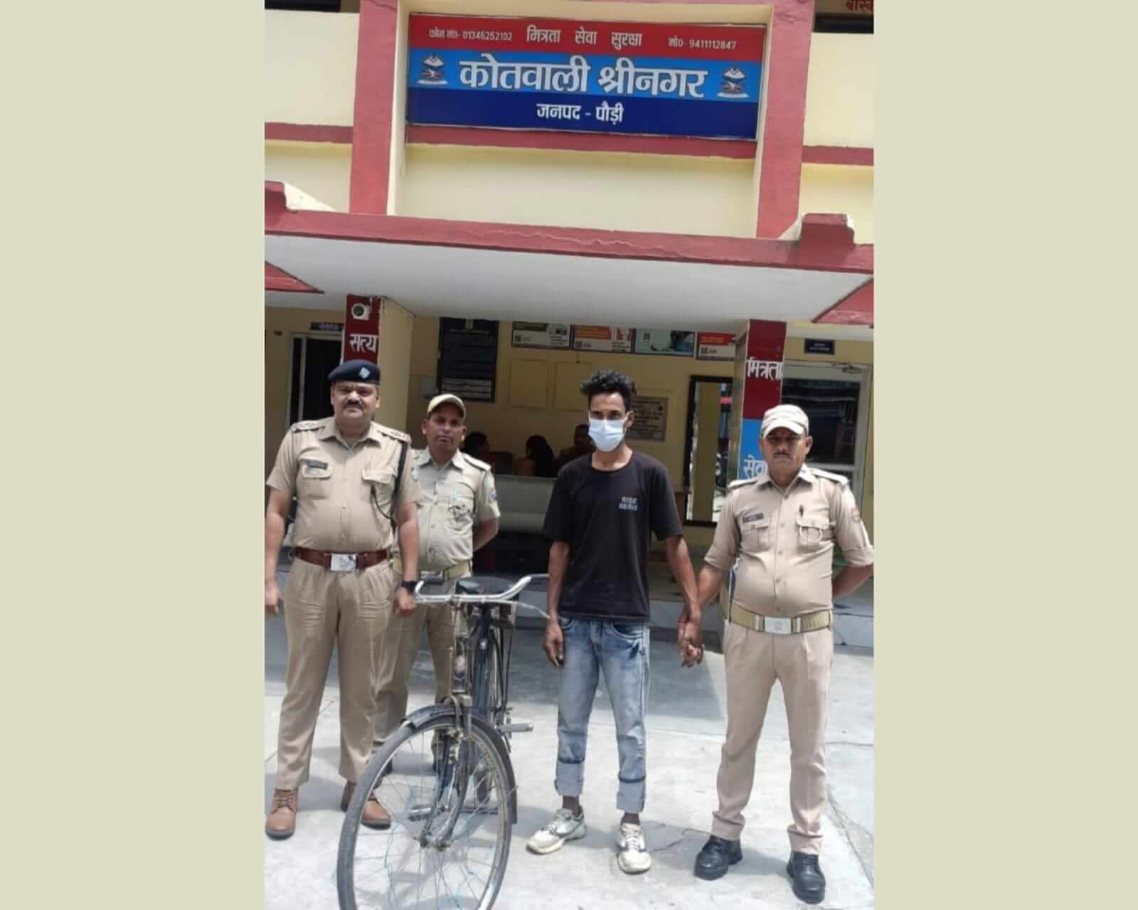 कोतवाली श्रीनगर पुलिस ने साईकिल चोरी करने वाले व्यक्ति को चोरी की गयी साईकिल के साथ किया गिरफ्तार।
