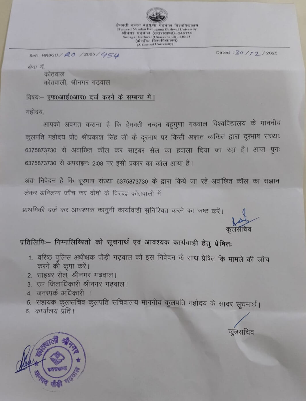 श्रीनगर गढ़वाल।31 दिसंबर हेमवती नंदन बहुगुणा गढ़वाल विश्वविद्यालय के कुलपति को अज्ञात व्यक्ति द्वारा लगातार कॉल कर परेशान किए जाने का मामला सामने आया है। इस संबंध में विश्वविद्यालय प्रशासन ने कोतवाली श्रीनगर में लिखित शिकायत दर्ज कराई है।विश्वविद्यालय के कुलसचिव द्वारा दिए गए प्रार्थना पत्र में बताया गया कि बीते कई दिनों से कुलपति को अलग-अलग नंबरों से कॉल कर परेशान किया जा रहा है। एक नंबर 6375873730 से लगातार कॉल कर स्वयं को साइबर सेल से जुड़ा बताकर दबाव बनाया जा रहा है। कुलसचिव ने मामले की गंभीरता को देखते हुए अज्ञात व्यक्ति की पहचान कर जांच किए जाने और आवश्यक कार्रवाई की मांग की है। कोतवाली श्रीनगर पुलिस ने शिकायत के आधार पर मामले की जांच शुरू कर दी है।