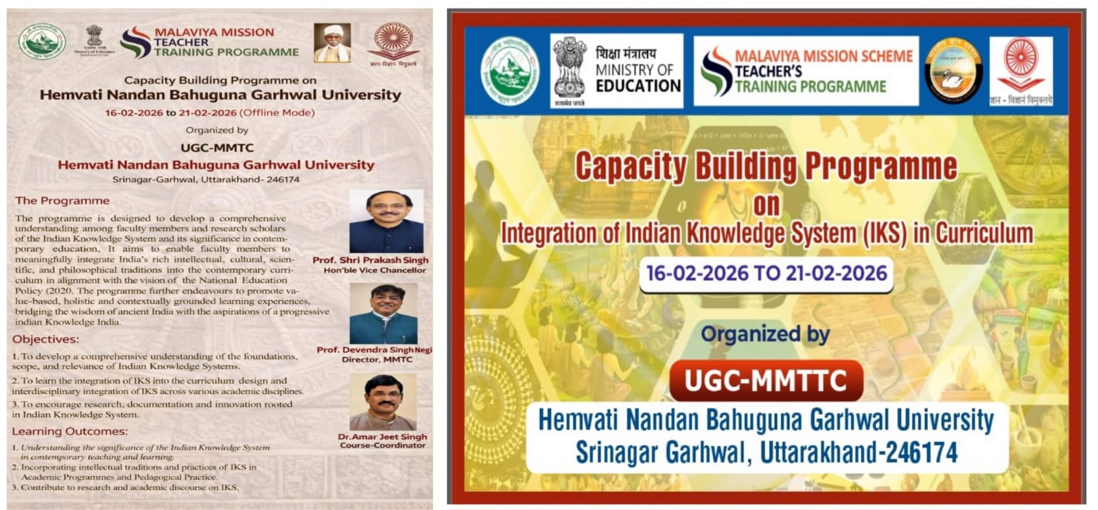 श्रीनगर गढ़वाल। श्रीनगर हेमवती नंदन बहुगुणा गढ़वाल विश्वविद्यालय के यूजीसी मालवीय मिशन टीचर्स ट्रेनिंग सेंटर एमएमटीसी की ओर से भारतीय ज्ञान परंपरा के पाठ्यक्रम में प्रभावी एकीकरण के उद्देश्य से 16 फरवरी से विशेष क्षमता निर्माण कार्यक्रम आयोजित किया जाएगा। एमएमटीसी के निदेशक प्रो.डीएस नेगी ने बताया कि शिक्षा मंत्रालय भारत सरकार और विश्वविद्यालय अनुदान आयोग द्वारा प्रायोजित यह प्रशिक्षण कार्यक्रम 16 से 21 फरवरी तक अकादमिक क्रियाकलाप केंद्र चौरास परिसर में आयोजित होगा। उन्होंने बताया कि प्रशिक्षण कार्यक्रम में देश के विभिन्न विश्वविद्यालयों से 55 संकाय सदस्य तथा विश्वविद्यालय नगर से 45 शोधार्थी प्रतिभाग करेंगे।यूजीसी की ओर से केंद्रीय संस्कृत विश्वविद्यालय के प्रो सुब्रमण्यम को कार्यक्रम की संपूर्ण अवधि के लिए पर्यवेक्षक नियुक्त किया गया है। प्रशिक्षण कार्यक्रम के समन्वयक के रूप में डॉ.अमरजीत सिंह को जिम्मेदारी सौंपी गई है।
