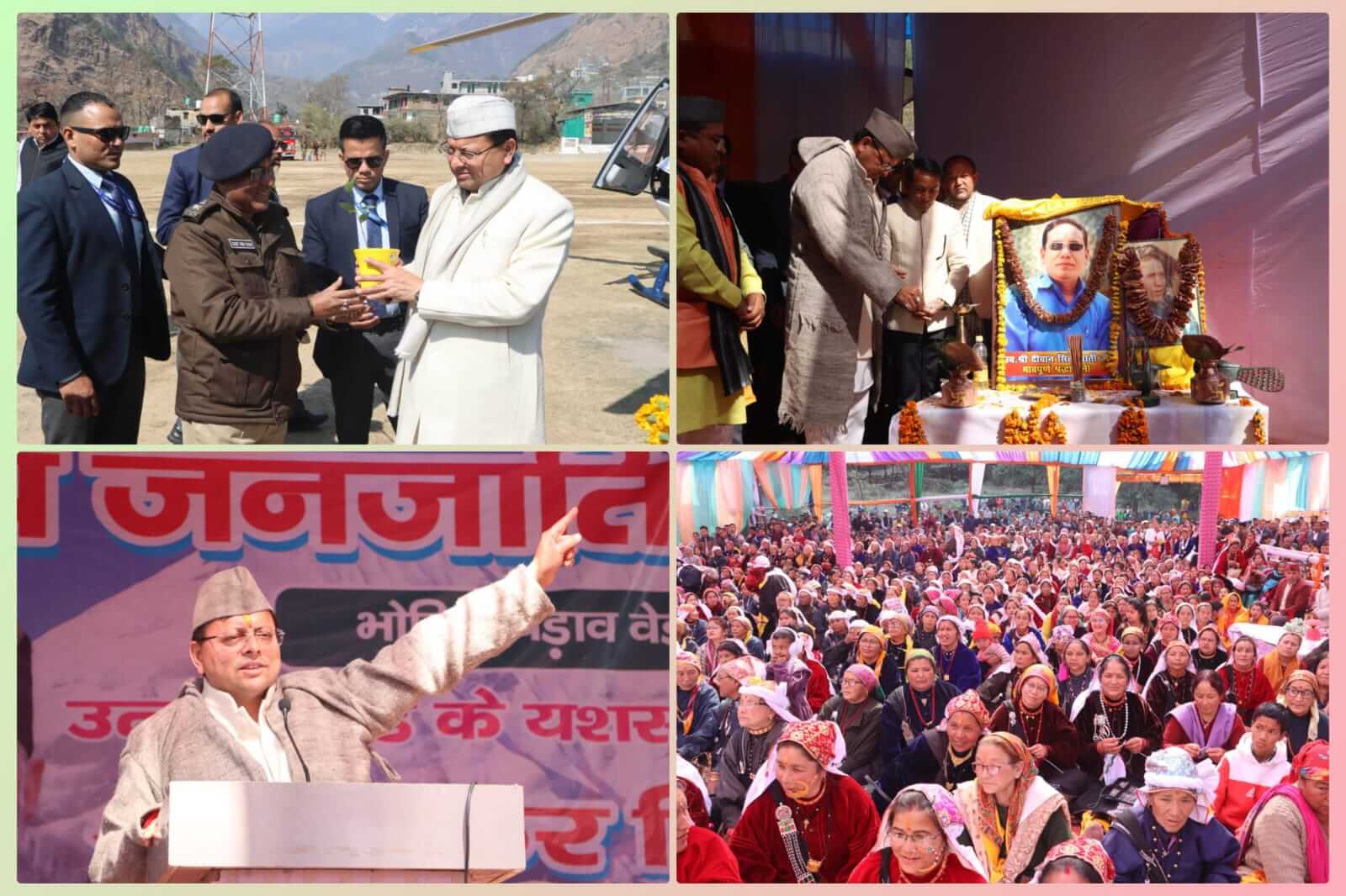 चमोली/श्रीनगर गढ़वाल। चमोली नीति माणा जनजाति कल्याण समिति द्वारा भोटिया पड़ाव बेडूबगड़ बिरही में आयोजित द्वितीय जनजाति समागम 2026 के समापन समारोह में मुख्यमंत्री पुष्कर सिंह धामी मुख्य अतिथि के रूप में शामिल हुए। मुख्यमंत्री के हेलीपैड पर पहुंचने पर जिलाधिकारी चमोली गौरव कुमार एवं पुलिस अधीक्षक चमोली सुरजीत सिंह पंवार ने उनका स्वागत किया। इस अवसर पर हरित उत्तराखंड के संकल्प के प्रतीक स्वरूप पौधा भेंट कर पर्यावरण संरक्षण का संदेश दिया गया। चमोली पुलिस के जवानों ने औपचारिक वर्दी में मुख्यमंत्री को सलामी दी।कार्यक्रम स्थल पर जनजातीय महिलाओं ने पारंपरिक पौण नृत्य प्रस्तुत कर मुख्यमंत्री का स्वागत किया। महिलाओं ने सम्मान स्वरूप उन्हें भोजपत्र की माला एवं पारंपरिक दोंका पहनाकर अभिनंदन किया। मुख्यमंत्री ने अपने संबोधन में जनजातीय समाज की वीरता और समृद्ध सांस्कृतिक विरासत की सराहना करते हुए कहा कि नीति माणा क्षेत्र की परंपराएं उत्तराखंड की पहचान हैं। उन्होंने कहा कि सीमांत क्षेत्रों का विकास तथा जनजातीय संस्कृति का संरक्षण सरकार की प्राथमिकता है। इस अवसर पर गजपाल बर्त्वाल दौलत सिंह बिष्ट अनिल नौटियाल भूपाल राम टम्टा राजेन्द्र सिंह भंडारी ऋषि प्रसाद सती हरक सिंह नेगी संदीप रावत हरीश परमार गुलाब सिंह संतोषी सहित अन्य जनप्रतिनिधि एवं गणमान्य नागरिक उपस्थित रहे।
