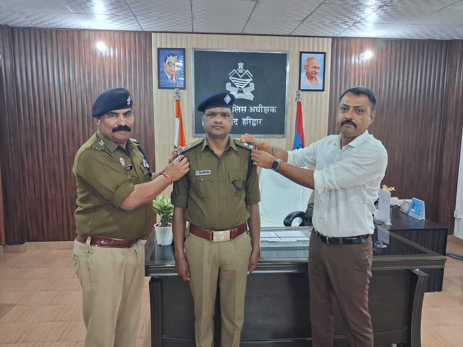 हरिद्वार/श्रीनगर गढ़वाल। पुलिस मुख्यालय के आदेश पर वरिष्ठता के आधार पर हेड कांस्टेबल से अपर उप निरीक्षक (एएसआई) पद पर पदोन्नत हुए जनपद हरिद्वार में तैनात जवान धनवीर कुमार ने सोमवार को वरिष्ठ पुलिस अधीक्षक नवनीत सिंह से पुलिस कार्यालय में शिष्टाचार भेंट की। इस दौरान एसएसपी नवनीत सिंह ने पदोन्नत हुए जवान को स्टार पहनाकर सम्मानित किया और मिठाई खिलाकर उन्हें बधाई दी। उन्होंने कहा कि पदोन्नति के साथ जिम्मेदारियां भी बढ़ती हैं इसलिए नई जिम्मेदारियों का निर्वहन पूरी निष्ठा ईमानदारी और कर्तव्यपरायणता के साथ किया जाए। इस अवसर पर पुलिस उपाधीक्षक सदर सहित अन्य पुलिस अधिकारी और कर्मचारी भी मौजूद रहे। वहीं पुलिस कार्यालय में मौजूद अधिकारियों व कर्मचारियों ने भी धनवीर कुमार को पदोन्नति की शुभकामनाएं दीं।