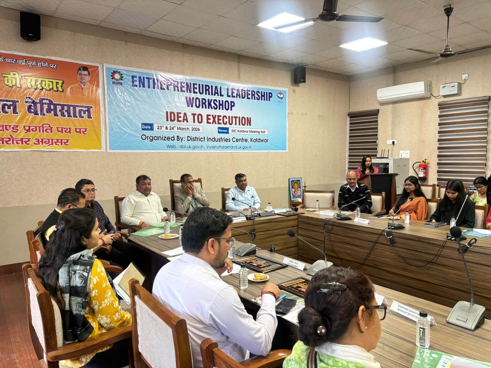 पौड़ी/श्रीनगर गढ़वाल। जिला उद्योग केन्द्र द्वारा आयोजित दो दिवसीय उद्यमिता नेतृत्व कार्यशाला का शुभारम्भ सोमवार को किया गया। कार्यशाला में उद्देश्य पर प्रकाश डालते हुए युवाओं एवं उद्यमियों को स्वरोजगार की दिशा में प्रेरित किया गया। कार्यक्रम की अध्यक्षता महाप्रबंधक जिला उद्योग केन्द्र द्वारा की गयी। कार्यशाला के विभिन्न सत्रों में विशेषज्ञों द्वारा प्रोजेक्ट स्थापना भूमि संबंधी प्रक्रियाएँ मैप अप्रूवल वित्तीय प्रबंधन एवं वित्तीय साक्षरता जैसे महत्वपूर्ण विषयों पर विस्तृत जानकारी दी गयी। बैंक एवं विभागीय अधिकारियों ने प्रतिभागियों को उद्योग स्थापना से संबंधित आवश्यक मार्गदर्शन प्रदान करते हुए योजनाओं की जानकारी भी साझा की। कार्यशाला में प्रतिभागियों ने सक्रिय सहभागिता करते हुए अपने अनुभव भी साझा किए। कार्यक्रम में प्रबंधक आर.पी.आर्य उपासना सिंह विवेक चौहान सचिव सिडकुल औद्योगिक निर्माता संघ सुनील गुप्ता अध्यक्ष सिडकुल औद्योगिक निर्माता संघ सुनील कुमार वित्तीय विशेषज्ञ भगत सिंह नेगी जेई सीडा रोहित रौतेला जेई सिडकुल कमल थापा चेयरमैन सिद्धबाबा कृषक उत्पादन संगठन विवेक जदली डिजिटल मार्केटिंग विशेषज्ञ सहित अनेक उद्यमी एवं प्रशिक्षक उपस्थित रहे।