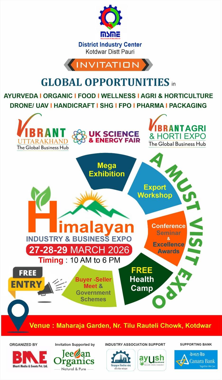 कोटद्वार-पौड़ी/श्रीनगर गढ़वाल। कोटद्वार शहर में पहली बार हिमालयन इंडस्ट्री एंड बिजनेस एक्सपो का आयोजन 27 से 29 मार्च तक महाराजा गार्डन तीलू रौतेली चौक के निकट किया जाएगा। कार्यक्रम का आयोजन जिला उद्योग केंद्र कोटद्वा द्वारा कराया जा रहा है। महाप्रबंधक उद्योग सोमनाथ गर्ग ने बताया कि एक्सपो में आयुर्वेद ऑर्गेनिक खाद्य प्रसंस्करण वेलनेस कृषि एवं बागवानी ड्रोन/यूएवी हस्तशिल्प स्वयं सहायता समूह (एसएचजी) किसान उत्पादक संगठन (एफपीओ) फार्मा और पैकेजिंग जैसे क्षेत्रों से जुड़े स्टॉल लगाए जाएंगे। उन्होंने बताया कि इनमें रैंप एवं स्टार्टअप (जिला उद्योग केंद्र) पृथ्वी विज्ञान मंत्रालय केंद्रीय प्रदूषण नियंत्रण बोर्ड वैज्ञानिक एवं औद्योगिक अनुसंधान परिषद नारियल विकास बोर्ड उत्तराखंड प्रदूषण नियंत्रण बोर्ड उत्तराखंड राज्य विज्ञान एवं प्रौद्योगिकी परिषद उत्तराखंड वन संसाधन प्रबंधन परियोजना भारतीय आयुर्विज्ञान अनुसंधान परिषद और तमिलनाडु उद्यानिकी विभाग शामिल हैं। इसके अलावा अन्य विभाग भी प्रतिभाग करेंगे। उन्होंने बताया कि तीन दिवसीय आयोजन के दौरान मेगा प्रदर्शनी निर्यात कार्यशाला सम्मेलन सेमिनार एवं उत्कृष्टता पुरस्कार खरीदार-विक्रेता और सरकारी योजनाओं की जानकारी दी जाएगी। साथ ही निःशुल्क स्वास्थ्य शिविर भी लगाया जाएगा। उन्होंने कि तीनों दिन विभिन्न विषयों पर सेमिनार आयोजित होंगे। उन्होंने नए व्यापार शुरू करने वाले युवाओं स्वरोजगार से जुड़े लोगों और आमजन से अधिक से अधिक संख्या में प्रतिभाग करने की अपील की है।