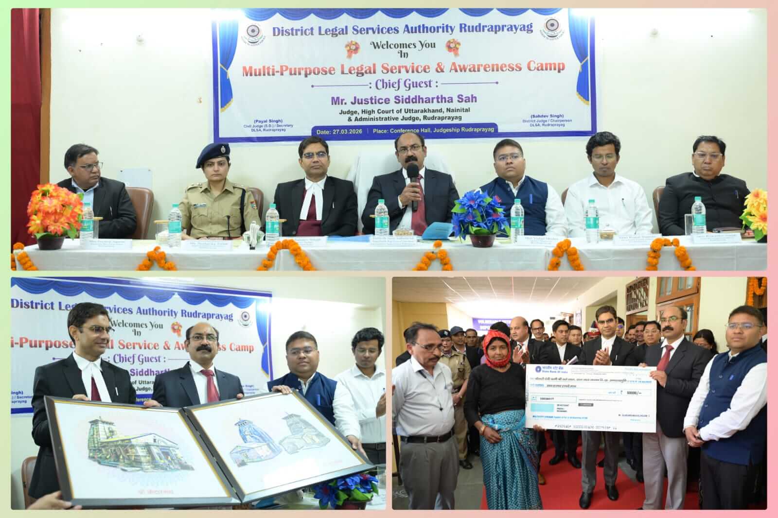 रूद्रप्रयाग/श्रीनगर गढ़वाल। जिला न्यायालय परिसर रुद्रप्रयाग में आज बहुउद्देशीय सेवा एवं जागरूकता शिविर का आयोजन किया गया। इस कार्यक्रम में उच्च न्यायालय उत्तराखण्ड के न्यायमूर्ति सिद्धार्थ शाह तथा जनपद रुद्रप्रयाग के प्रशासनिक जज मुख्य अतिथि के रूप में उपस्थित रहे। शिविर के दौरान आम नागरिकों को निःशुल्क कानूनी परामर्श और जानकारी प्रदान की गई जिससे लोगों में कानून के प्रति जागरूकता बढ़ सके। इसके साथ ही विभिन्न विभागों द्वारा स्टॉल लगाए गए जहां सरकारी योजनाओं और सेवाओं की जानकारी दी गई। शिविर में विभिन्न विभागों के स्टाल लगाए गए जहाँ अधिकारियों ने स्वास्थ्यए शिक्षाए महिला कल्याण और पेंशन जैसी योजनाओं पर मार्गदर्शन किया। कई ग्रामीणों ने भूमि-अभिलेख आधार सुधार और पारिवारिक विवादों से जुड़े प्रश्नों के जवाब पाए। न्यायमूर्ति शाह ने अपने संबोधन में सुलभ न्याय और विधिक साक्षरता पर ज़ोर दियाए वहीं प्रशासनिक जज ने जनसहभागिता को ऐसी पहल की रीढ़ बताया। मुख्य न्यायाधीश ने शिविर में उपस्थित सभी महानुभावों को धन्यवाद देते हुए कहा कि आज उनके द्वारा समूचे न्यायालय परिसर का स्थलीय निरीक्षण किया गया। निरीक्षण के दौरान सभी व्यवस्था चाक-चौबंद मिलने पर प्रसन्नता जताई। उन्होंने अधिवक्ताओं द्वारा दिए गए मांग पत्र पर आवश्यक कार्यवाही का आश्वासन दिया। इससे पूर्व जनपद न्यायाधीश सहदेव ने न्यायमूर्ति के जनपद आगमन पर धन्यवाद ज्ञापित करते हुए कहा कि शिविर में उनकी उपस्थिति से आज सभी उत्साहित हैं। उन्होंने न्यायमूर्ति को आश्वासन देते हुए कहा कि उनके द्वारा दिए गए मार्ग दर्शन में जो भी दिशा निर्देश मिले हैं उनका अनुपालन सुनिश्चित किया जाएगा। बार संघ के अध्यक्ष प्रदीप जगवाण ने कहा कि जनपद में बार सघ व न्यायिक कार्मिकों का आपसी समन्वय काफी बेहतर है। उन्होंने न्यायमूर्ति के आगमन पर धन्यवाद देते हुए उनके उज्जवल भविष्य की कामना की। कार्यक्रम में जिलाधिकारी विशाल मिश्रा ने न्यायमूर्ति का जनपद आगमन पर गर्मजोशी से स्वागत कर उन्हें भगवान श्री केदारनाथ का मोमेंटो देकर सम्मान किया। कार्यक्रम के समापन पर अलग-अलग क्षेत्रों में उत्कृष्ट कार्य करने वाले कर्मियों नागरिकों शिक्षकों आंगनबाड़ी कार्यकर्ताओं और स्वयंसेवियों को प्रशस्तिण-पत्र देकर सम्मानित किया गया।जिला विधिक सेवा प्राधिकरण रूद्रप्रयाग ने बताया कि ऐसे शिविर दूरस्थ इलाकों में न्याय और प्रशासन के बीच सेतु बनाते हैं। उपस्थित लोगों ने पहल की सराहना की और भविष्य में नियमित शिविरों की माँग की।शिविर के दौरान विभिन्न योजनाओं के तहत पात्र लाभार्थियों को चेक वितरित किए गए। इस अवसर पर जिलाधिकारी विशाल मिश्रा पुलिस अध