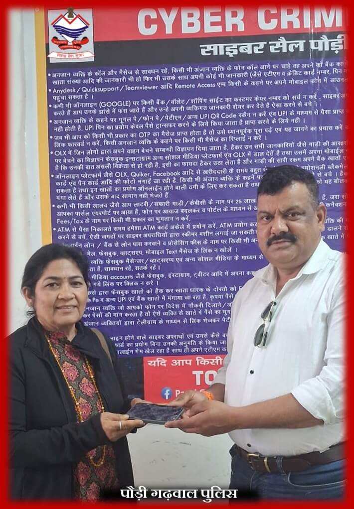 श्रीनगर गढ़वाल। पौड़ी जनपद में तकनीक और पुलिस की सक्रियता का बेहतर उदाहरण सामने आया है जहां खोया हुआ महंगा मोबाइल फोन बरामद कर उसकी स्वामिनी को सकुशल वापस सौंप दिया गया। न्यू डांग श्रीनगर गढ़वाल निवासी डॉ.कविता रावत द्वारा महिला थाना श्रीनगर में अपने आईफोन 15 के खोने की सूचना दर्ज कराई गई थी। मोबाइल की कीमत लगभग 96 हजार रुपये बताई गई थी। मामले को गंभीरता से लेते हुए महिला थाना श्रीनगर के प्रार्थना पत्र के आधार पर सीआईयू टीम ने तकनीकी मदद से कार्रवाई शुरू की। सीआईयू टीम ने सीईआईआर पोर्टल के माध्यम से मोबाइल की लोकेशन लगातार ट्रैक की। लगातार प्रयास और तकनीकी विश्लेषण के बाद मोबाइल को उत्तर प्रदेश के एक शहर से बरामद कर लिया गया। बरामद मोबाइल को सुरक्षित रूप से वापस लाकर संबंधित स्वामिनी को सौंप दिया गया। मोबाइल मिलने पर आवेदिका ने पुलिस टीम का आभार व्यक्त किया। पुलिस ने आमजन से अपील की है कि मोबाइल खोने या चोरी होने की स्थिति में तुरंत सीईआईआर पोर्टल पर शिकायत दर्ज कराएं ताकि समय रहते कार्रवाई कर मोबाइल की बरामदगी सुनिश्चित की जा सके।