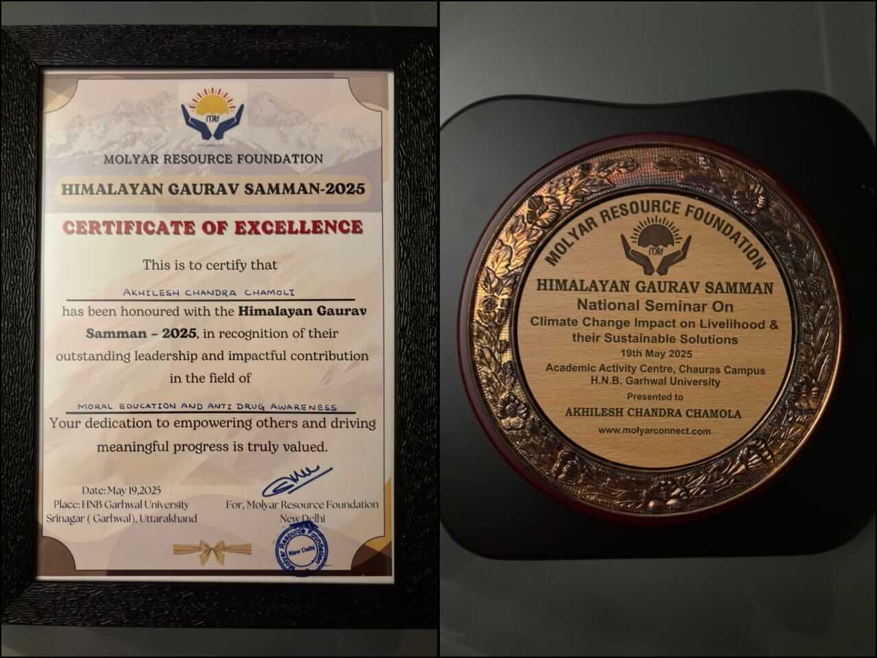 श्रीनगर गढ़वाल।मोल्यार रिसोर्स फाउंडेशन नयी दिल्ली द्वारा आयोजित राष्ट्रीय सेमिनार केन्द्रीय विश्वविद्यालय श्रीनगर गढ़वाल के चौरास परिसर के सभागार में आयोजित हुआ। आयोजित राष्ट्रीय कार्यक्रम के प्रथम सत्र में पर्यावरण संरक्षण,मानसून परिवर्तन,अग्नि से बनों की सुरक्षा,आस पास के वातावरण को कैसे स्वच्छ रखें आदि सम सामयिक विषयों पर विशद रुप से चर्चा परिचर्चा हुई।केन्द्रीय विश्वविद्यालय श्रीनगर गढ़वाल के कुलपति बतौर मुख्य अतिथि रहे। द्वितीय सत्र में उन दिव्य महाविभूतियों को जिन्होंने समाज में नया कीर्तिमान स्थापित किया है। उन्हें सम्मानित किया गया। जनपद पौड़ी गढ़वाल विकास खंड खिर्सू से राजकीय इण्टर कॉलेज सुमाडी में वरिष्ठ हिन्दी अध्यापक के पद पर कार्यरत अखिलेश चन्द्र चमोला को केन्द्रीय विश्वविद्यालय श्रीनगर गढ़वाल के कुलपति प्रोफेसर मन मोहन सिंह रौथाड के हाथों हिमालयन श्री गौरव सम्मान से सम्मानित होने का गौरव प्राप्त हुआ। जिसमें अतिथियों द्वारा चमोला को सम्मानित करते हुए कहा कि अखिलेश चन्द्र चमोला इस तरह के सखिशियत हैं जो उत्तराखंड से निरन्तर धर्म,साहित्य,पर्यावरण,प्रेरणा दायिनी प्रेरक प्रसंग,भावी पीढ़ी के सफल मार्ग दर्शन में अतुलनीय योगदान देते रहे हैं।5000से अधिक युवाओं को नशा न करने की प्रतिज्ञा दिलाने के साथ ही 28 वर्षों से ग्रामीण आन्चिलिक में अध्ययन उत्तराखंड बोर्ड परीक्षा में में प्रथम श्रेणी में उत्तीर्ण छात्र छात्राओं को अपने निजी व्यय पर भव्य आयोजित कार्यक्रम में सम्मानित करने का कार्य करते रहते हैं। समाज में बेहतरीन कार्य करने वाले को भी प्रोत्साहित करके सम्मानित करते हैं। हिमालयन राष्ट्रीय गौरव सम्मान 2025से सम्मानित होने पर कैबिनेट शिक्षा मंत्री डाक्टर धन सिंह रावत ने बधाई देते हुए कहा कि-चमोला अपने अध्यापन कार्य करने के साथ ही आम जनमानस को नशे से दूर रहने की जो मुहिम चलाने के साथ सनातनी संस्कृति का व्यापक प्रचार-प्रसार करने में अपना बहुमूल्य योगदान दे रहे हैं। इस सम्मान से शिक्षक समुदाय के गौरव में श्री वृद्धि होती है।निस्संदेह चमोला बधाई के पात्र हैं। शारीरिक शिक्षा के शिक्षक विद मनीष कोठियाल ने कहा इस उपलब्धि से चमोला ने विकास खंड खिर्सू के गौरव में श्री बृद्वि की है। बताते चलें कि चमोला जनपद रुद्रप्रयाग के ग्राम कौशलपुर के मूल निवासी हैं। वर्तमान में गढ़वाल मन्डलीय नशा उन्मूलन नोडल अधिकारी के दायित्व का भी निर्वहन कर रहे हैं।500 से भी अधिक राष्ट्रीय सम्मानोपाधियो से भी सम्मानित हो चुके हैं।