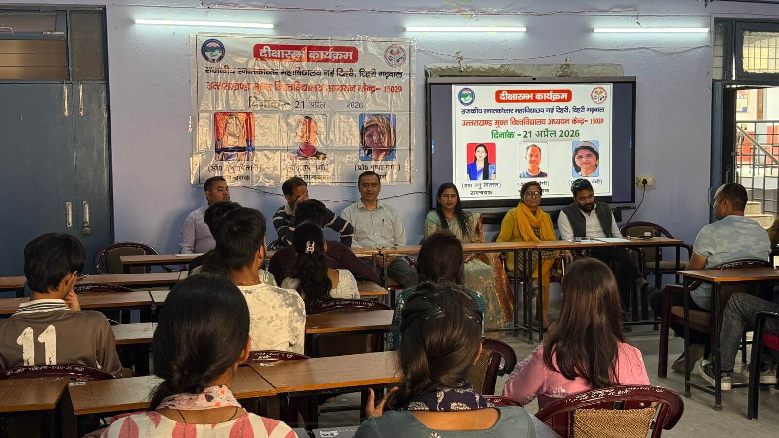 टिहरी/श्रीनगर गढ़वाल। राजकीय स्नातकोत्तर महाविद्यालय नई टिहरी में अध्ययन केन्द्र 15029 के अंतर्गत नव प्रवेशित छात्र-छात्राओं के लिए दीक्षारंभ कार्यक्रम का आयोजन 21 अप्रैल 2026 को किया गया। कार्यक्रम का शुभारंभ प्रभारी प्राचार्य प्रो.राज कुमार त्यागी समन्वयक डॉ.तनु मित्तल एवं सह-समन्वयक डॉ.हर्ष सिंह नेगी द्वारा दीप प्रज्वलित कर किया गया। कार्यक्रम में छात्र-छात्राओं को विश्वविद्यालय की शैक्षणिक प्रणाली पाठ्यक्रम संरचना अध्ययन पद्धति और परीक्षा प्रक्रियाओं की विस्तृत जानकारी दी गई। इस दौरान प्राध्यापकों और अध्ययन केन्द्र के समन्वयकों ने विद्यार्थियों का मार्गदर्शन करते हुए उनकी जिज्ञासाओं का समाधान किया। प्रभारी प्राचार्य प्रो.राज कुमार त्यागी ने विद्यार्थियों को अनुशासन और नियमित अध्ययन के महत्व के बारे में बताया। समन्वयक डॉ.तनु मित्तल और सह-समन्वयक डॉ.हर्ष सिंह नेगी ने विश्वविद्यालय की कार्यप्रणाली और अध्ययन से जुड़ी महत्वपूर्ण जानकारियां साझा कीं। डॉ.कमलेश पांडेय और डॉ.हेमलता बिष्ट ने भी छात्र-छात्राओं को आवश्यक दिशा-निर्देश दिए। कार्यक्रम में नव प्रवेशित सभी छात्र-छात्राओं की उपस्थिति सुनिश्चित की गई और उन्हें नियमित अध्ययन के प्रति प्रेरित किया गया। इस अवसर पर डॉ.कमलेश पांडेय डॉ.हेमलता बिष्ट गौरव कुमार अमित चमोली अंकित कुमार मान सिंह छात्र संघ अध्यक्ष मनजीत शाह पूर्व छात्र संघ अध्यक्ष युवराज शाह जिशान प्रेरणा शालिनी उपकार आदित्य विकास एवं शोभा सहित अन्य उपस्थित रहे। महाविद्यालय प्रशासन ने सभी छात्र-छात्राओं से अपेक्षा की है कि वे भविष्य में भी इसी प्रकार शैक्षणिक गतिविधियों में सक्रिय सहभागिता निभाएं।