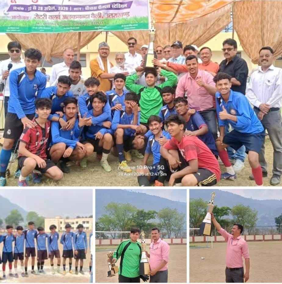 श्रीनगर गढ़वाल। श्रीनगर स्थित रेनबो पब्लिक स्कूल ने लेट नंददीप मल्ल एवं लेट आयुष नेगी मेमोरियल फुटबॉल टूर्नामेंट में शानदार प्रदर्शन करते हुए चैंपियनशिप ट्रॉफी अपने नाम कर ली। यह प्रतियोगिता रोटरी क्लब अलकनंदा वैली श्रीनगर गढ़वाल द्वारा आयोजित की गई थी जिसमें विभिन्न टीमों ने भाग लिया। पूरे टूर्नामेंट के दौरान स्कूल की टीम ने बेहतरीन खेल का प्रदर्शन किया और हर मुकाबले में अपना दबदबा बनाए रखा। फाइनल मुकाबले में भी टीम ने उत्कृष्ट प्रदर्शन करते हुए जीत हासिल की और खिताब पर कब्जा जमाया। इस प्रतियोगिता में टीम के खिलाड़ी अमन चौहान को उनके शानदार प्रदर्शन के लिए ‘सर्वश्रेष्ठ गोलकीपर’ का पुरस्कार दिया गया। उनके बेहतरीन बचाव और खेल कौशल ने टीम की जीत में महत्वपूर्ण भूमिका निभाई। टीम की इस सफलता पर विद्यालय परिवार में खुशी का माहौल है। खिलाड़ियों के उत्कृष्ट प्रदर्शन ने न केवल विद्यालय का नाम रोशन किया बल्कि अन्य विद्यार्थियों के लिए भी प्रेरणा प्रस्तुत की है।