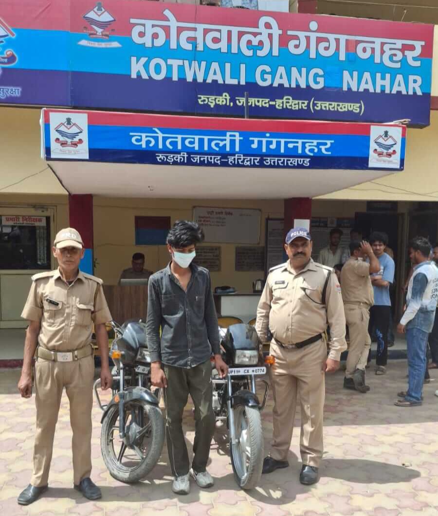 गंगनहर-हरिद्वार/श्रीनगर गढ़वाल। हरिद्वार पुलिस द्वारा अपराध पर प्रभावी अंकुश लगाने के तहत लगातार कार्रवाई की जा रही है। इसी क्रम में कोतवाली गंगनहर पुलिस ने वाहन चोरी की घटना का सफल खुलासा करते हुए एक आरोपी को गिरफ्तार किया है और उसके कब्जे से दो चोरी की मोटरसाइकिल बरामद की गई हैं। 26 अप्रैल 2026 को महेवह खुर्द उर्फ नागल, थाना कलियर निवासी आंसू ने थाना गंगनहर में सूचना दी थी कि उनकी स्प्लेंडर मोटरसाइकिल संख्या UK08AW5323 अज्ञात व्यक्ति द्वारा चोरी कर ली गई है। सूचना के आधार पर पुलिस ने मामला दर्ज कर जांच शुरू की। वरिष्ठ पुलिस अधीक्षक हरिद्वार के निर्देश पर पुलिस अधीक्षक ग्रामीण और क्षेत्राधिकारी रुड़की के पर्यवेक्षण में प्रभारी निरीक्षक गंगनहर द्वारा टीम गठित कर घटना के खुलासे के प्रयास तेज किए गए। पुलिस टीम ने घटनास्थल के आसपास लगे सीसीटीवी कैमरों की जांच की संदिग्ध व्यक्तियों की पहचान की और मुखबिर तंत्र को सक्रिय किया। 28 अप्रैल 2026 को पुलिस टीम ने पनियाला पडली रोड के पास चेकिंग के दौरान एक संदिग्ध व्यक्ति को हिरासत में लिया। पूछताछ और उसकी निशानदेही पर दो मोटरसाइकिल बरामद की गईं। बरामद वाहनों में स्प्लेंडर प्लस संख्या UK08AW5323 और स्प्लेंडर संख्या UP11CX0774 शामिल हैं। इनमें से एक वाहन के संबंध में कोतवाली रुड़की में पहले से मामला दर्ज है। बरामदगी के आधार पर मामले में आवश्यक विधिक कार्रवाई की जा रही है। आरोपी का नाम और पता तौसीफ पुत्र अखलाक निवासी सौम्या मस्जिद के पास कोतवाली सिविल लाइन जनपद हरिद्वार उम्र 20 वर्ष