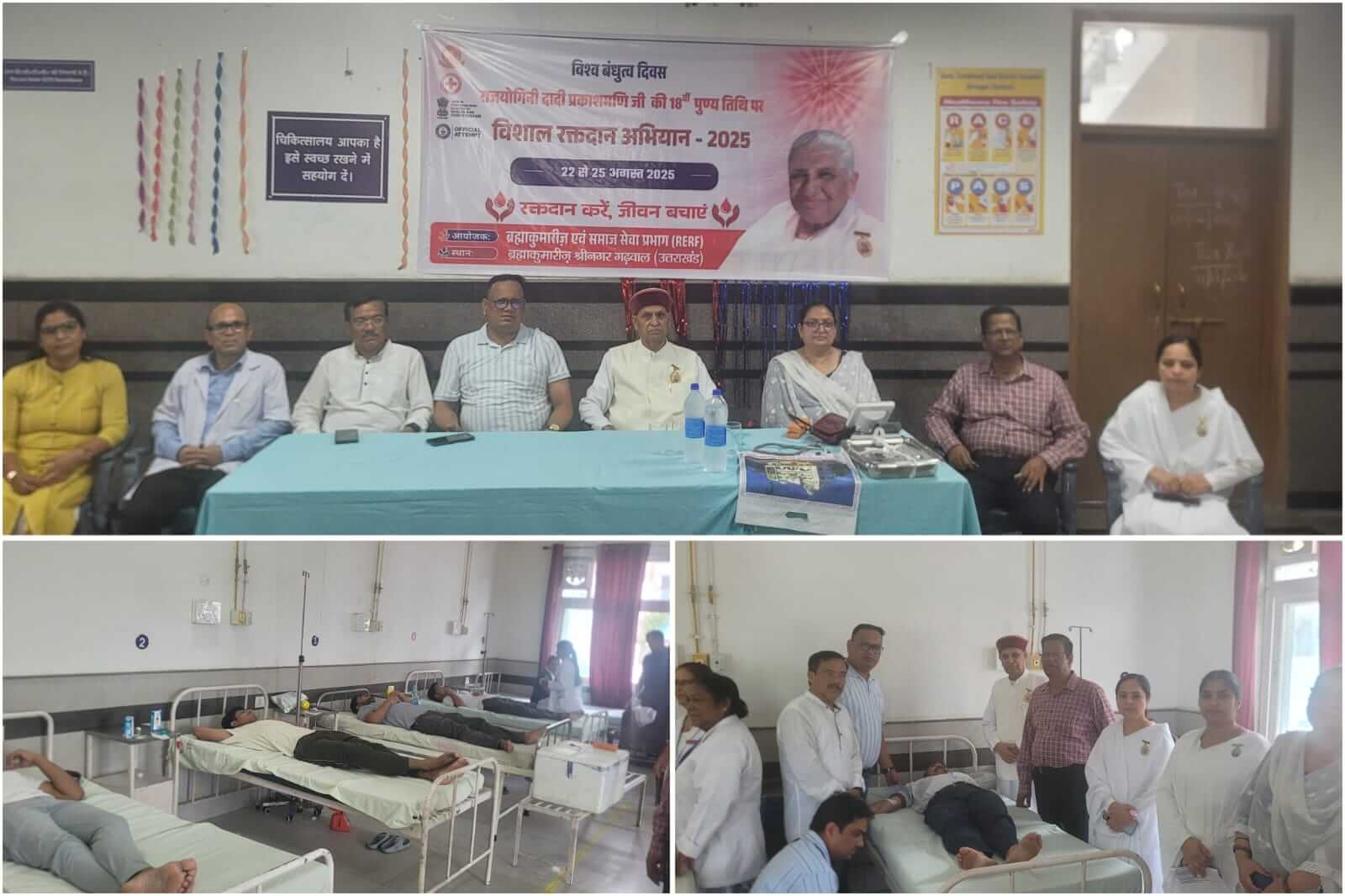 श्रीनगर गढ़वाल। श्रीनगर ब्रह्माकुमारीज़ संस्थान की ओर से सामूहिक रूप मे श्रीनगर,उत्तरकाशी और गोपेश्वर में रक्तदान शिविर का आयोजन किया गया। जिसमें श्रीनगर में 54,उत्तरकाशी में 21 और गोपेश्वर में 17 यूनिट कुल 92 यूनिट रक्तदान हुआ।अभियान की विशेषता यह रही कि हिंदू मुस्लिम और सिख धर्म के अनुयायियों ने मिलकर रक्तदान किया।इस अभियान का संचालन कर रहे ब्रह्माकुमारीज उत्तराखंड के निदेशक राजयोगी ब्रह्माकुमार भ्राता मेहरचंद ने बताया कि यह अभियान संस्थान की पूर्व मुख्य प्रशासिका राजयोगिनी दादी प्रकाशमणि जी की 18वीं पुण्यतिथि 25 अगस्त 2025,जिसे विश्व बंधुत्व दिवस के रूप में मनाया जाता है,के उपलक्ष्य भारत एवं नेपाल में एक विशाल रक्तदान महाअभियान चलाया जा रहा है। कहा की आज इस अभियान की शुरुआत हुई है जो की 25 अगस्त तक चलेगा उन्होंने कहा कि कुल 200 यूनिट रक्त लेने का लक्ष्य रखा गया है।कल यह अभियान रुद्रप्रयाग,पौड़ी,टिहरी और गैरसेंण में चलाया जाएगा।ब्रह्माकुमारी नीलम बहन सेवाकेंद्र प्रभारी श्रीनगर गढ़वाल ने बताया कि इस अभियान का उद्देश्य रक्त की आवश्यकता की पूर्ति करना एवं गिनीज़ वर्ल्ड रिकार्ड बनाना है। उन्होंने कहा कि इस अभियान का आयोजन श्रीनगर के राजकीय संयुक्त अस्पताल में किया गया जिसमें गढ़वाल विश्वविद्यालय के बी.ए,बी.एस.सी और बी.फार्मा के छात्र-छात्राओं,संयुक्त अस्पताल के डॉक्टर और कर्मचारियों सहित स्थानीय रक्तदाताओं ने बड़े उमंग उत्साह से भाग लिया।सभी रक्तदाताओं को सर्टिफिकेट देकर सम्मानित भी किया गया।इस अवसर पर उन्होंने स्वास्थ्य मंत्री डॉ.धन सिंह रावत,ब्लड बैंक प्रभारी डॉक्टर सतीश,मुख्य चिकित्सा अधीक्षक डॉक्टर विमल गुसाई,डॉ.गोविंद पुजारी,डॉक्टर शुभम,कुशलानंद भट्ट साहिल भट्ट,सतीश कला,नजमुल राव,गोविंद सिंह का विशेष रूप से आभार प्रकट किया